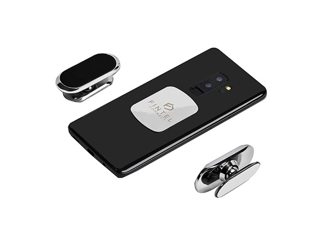 Keep your hands free and your phone securely in the optimal position for viewing maps, with this elegant magnetic phone mount for your car. The mount itself has a 3M tape base to stick securely onto your dashboard. It’s quite a commitment, but you’ll be glad you did it! It has a strong magnet which will secure your phone via the accompanying thin metal plate which sticks to the back of your phone or phone cover. Logo branding is offered on the metal plate.