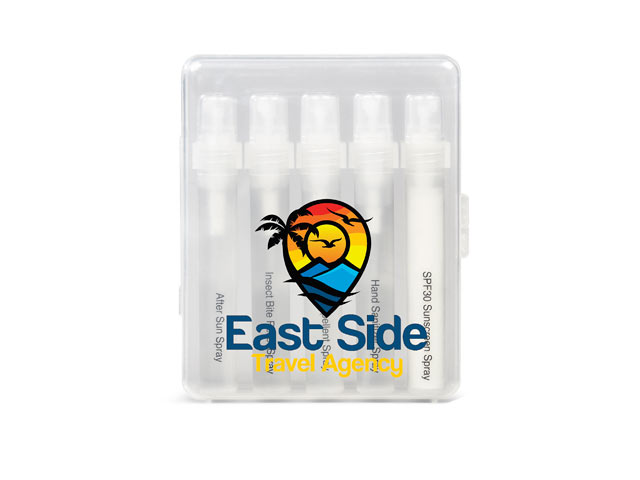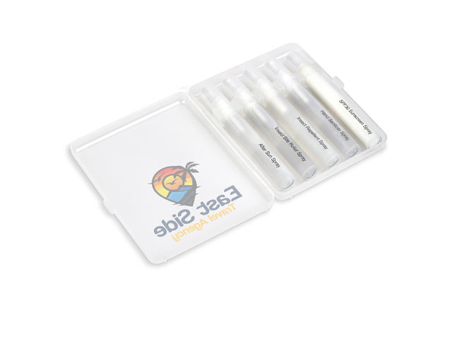 Take this clever and compact kit with you when travelling, camping, picnicking, or hiking. It features 5 useful sprays, securely packed together in a durable transparent case.