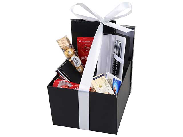 includes: 1 x exec a5 notebook, 1 x roller ball andamp; ball point pen set, 1 x exec cardholder, 1 x silicone cellphone card holder, 1 x 100g lindt lindor single slab, 1 x 63g ferrero rocher box [5-piece], 2 x 50g sally williams choc bars, 1 x 37g lindt lindor box [3-piece] and 1 x 65g packet of whispers