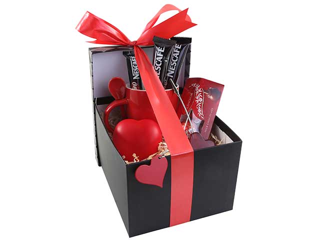 includes: 1 x dual heart keyring, 1 x heart stressball, 1 x heart memo clip, 1 x sublimation rim mug, 3 x lindor balls and 3 x cappuccino sachets