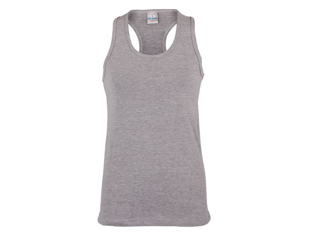Ladies raceback Features: Fitted Self-fabric neckline and armhole, panel detail at back Midweight, 160gm Side seamed Double stitching on sleeves and hems