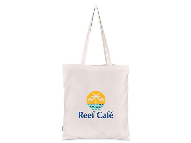 Proudly carry your pre-printed Recycled PET bag to promote your commitment to protecting the environment. This reusable bag is manufactured from material made from recycled plastic bottles. The one side of the bag is already pre-printed with the recycled message, while the other side is available to be branded with your logo or additional message.