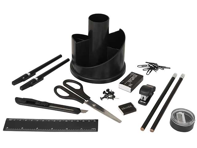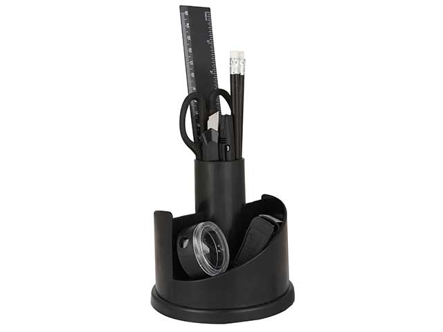 includes: 1 x rotating base, 1 x scissors, 2 x pens, 2 x pencils, 1 x pencil sharpener, 1 x eraser, 1 x 15cm ruler, 1 x stapler, 1 x box of staples [500pcs], 5 x push pins, 10 x paper clips and 1 x utility knife